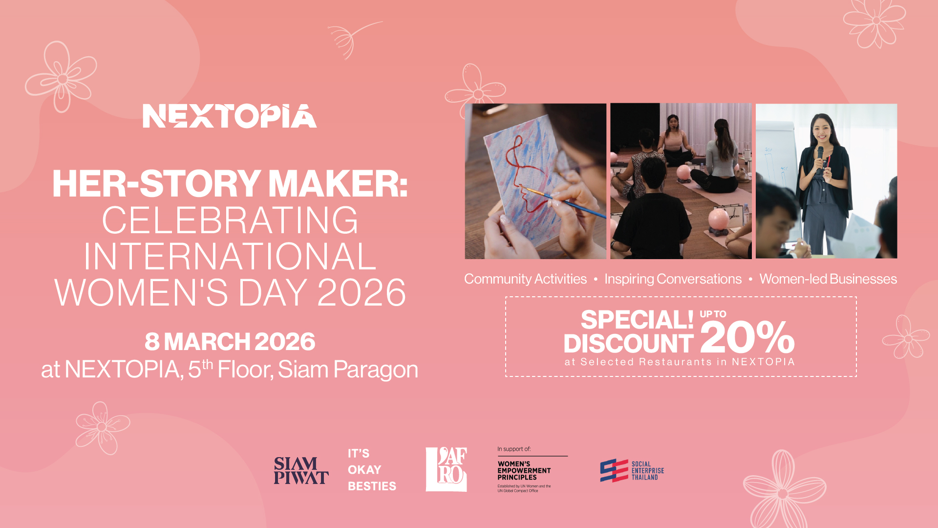 ทุกวันที่ 8 มีนาคม วันสตรีสากล (International Women’s Day: IWD) คือช่วงเวลาที่ทั่วโลกพร้อมใจกันยกย่องความสำเร็จของผู้หญิงในทุกมิติ พร้อมผลักดันให้ความเสมอภาคทางเพศเกิดขึ้นอย่างเป็นรูปธรรม ปีนี้ กลุ่มบริษัทสยามพิวรรธน์ โดยสยามพารากอน ได้ร่วมกับพันธมิตรหลายภาคส่วน จัดกิจกรรมเพื่อเฉลิมฉลองให้กับพลังหญิง ภายใต้คอนเซ็ปต์ “HER-story Maker: Celebrating International Women’s Day 2026 เพราะโลกที่น่าอยู่ เริ่มต้นจากพลังแห่งการร่วมสร้างสรรค์โดยผู้หญิง” รวมเหล่า Change-makers, ผู้ประกอบการ, ศิลปิน และผู้นำทางความคิด (KOLs) จากหลากหลายคอมมูนิตี้ ร่วมเจาะลึกแนวคิดการพัฒนาตนเองอย่างยั่งยืนจากภายในสู่ภายนอก พร้อมขับเคลื่อนกลไกทางสังคมและเศรษฐกิจไทยให้เติบโตอย่างแข็งแกร่งและยั่งยืนไปพร้อมกัน โดยกิจกรรมไฮไลต์จัดขึ้นที่ NEXTOPIA ได้แก่